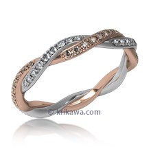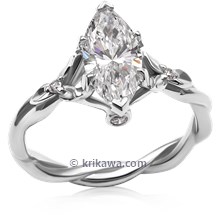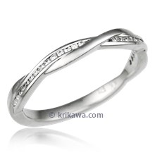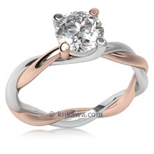 Bands of paved diamonds wrap around each other in elegant twists, leading up to the 3.4mm princess cut diamond center stone. A square halo of more pave set diamonds beautifully frames the center stone. This contemporary engagement ring is a timeless work of art!