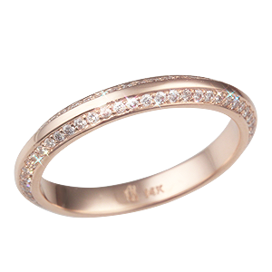 This wedding band is designed to be worn with the Juicy Light Engagement Ring. It has beveled edges that are paved with diamonds. Actual width around 2.7mm.