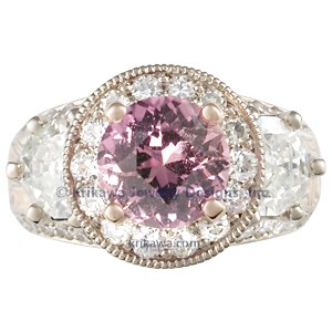 A unique engagement ring resembling a temple of a goddess! A unique design has a halo of pave diamonds and hand-rolled millegrain. A tapered juicy band curves along your finger. Accent stones are mounted in a prong basket and traced along the band. The band is lined with mokume which is the ancient Japanese method of folding precious metals.Shown in champagne mokume with 14k rose gold. Mounted with a Peach sapphire.