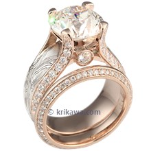 This stunning ring has a design cut aquamarine. Our juicy profile sweeps around your finger with tapered accent stones. A mokume band circles around the band. This is a Japanese method of folding precious metals to create a unique pattern. Truly one-of-a-kind with your choice of stones, mokume-gane, and metal colors.*To maintain the signature juicy look, the suggested center stone shapes are square cushion and round gems. Stones have a required size to keep the juicy profile. Round stones need to be at least 8mm (2-carat) and Square Cushion needs to be at least 7mm wide. With smaller center stone sizes, we recommend adding a diamond halo to achieve the signature flair. Please inquire about other stone shapes.