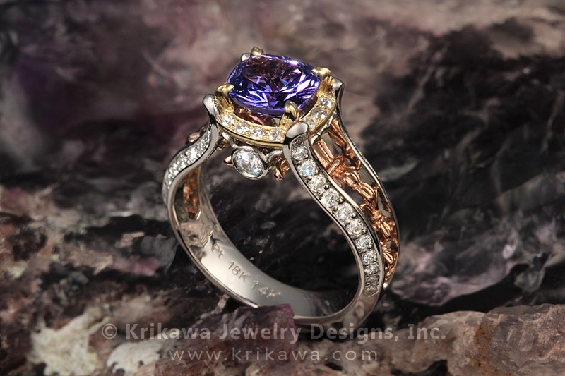Shown in platinum, yellow gold, and rose gold, with a 1.6 carat violet sapphire cushion.