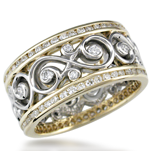 This symbol is the 'Power of Love' and comes from West Africa. It means "odo nnyew fie kwan" translated to 'love never loses it's way home. A beautiful symbol with beautiful meaning. The symbol repeats around the band in an eternity style with round bezel set diamonds between each pair. The matte background sets off beautifully with the polished symbols. The rails are pave set with diamonds and millegrain details. Choose two tone metals or one, the choice is yours!