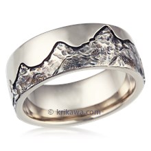 This one-of-a-kind wedding band is carved with the image of Manitoba Mountain. Natural, unplated white gold.