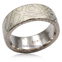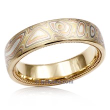 This mokume wedding band has millegrained beads around its edges. A darkened groove surrounds the mokume of your choice.