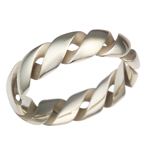 This modern wedding band is a two revolution mobius with eleven twists. It creates the illusion of two independent, flexible halves when in fact it is one- beautiful symbolism! You can actually squeeze the two sides and see a slight spring. It's a total brain puzzle! It's not two pieces; it's one. A true mobius strip.
