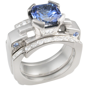 Perfect for a partner who loves architectural designs. A modern variation of the Mokume Falling Water Engagement Ring. Inspired by Frank Lloyd Wright structures, features strong horizontal and vertical lines used. A unique profile with a geometric band holds inlaid gemstones. Wide prongs secure your one-of-a-kind center stone. A perfect modern engagement ring for the innovative lover.Shown in platinum with a 6mm round blue sapphire center.