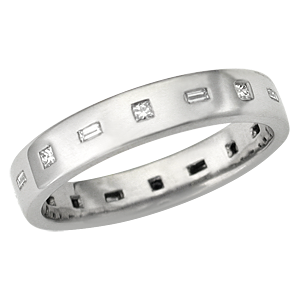 A simple band is redefined with alternating princess cut and baguette diamonds. Pair it with a modern engagement ring design, such as the Modern Straight, or wear it alone. 4 mm wide shown. Ideal cut diamonds.