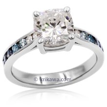 Shown in 14k pd white gold with a 0.91ct natural diamond center stone and natural sapphire accent stones.