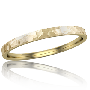 A creative and rustic touch on a classic solitaire engagement ring. The delicate hand-hammered finish gives the band character and texture. Your dream center stone is mounted in a semi-bezel setting. This style of mount allows the stone to shine brighter while staying secure. Imagine this stone with your choice of metal tones! The band is 2.5mm width at the palm.Shown in 14k white gold with diamond.