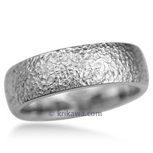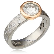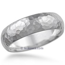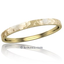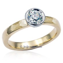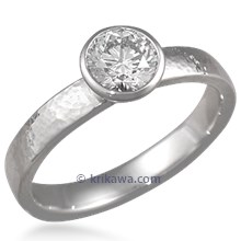 A creative and rustic touch on a classic solitaire engagement ring. The delicate hand-hammered finish gives the band character and texture. Your dream center stone is mounted in a semi-bezel setting. This style of mount allows the stone to shine brighter while staying secure. Imagine this stone with your choice of metal tones! The band is 2.5mm width at the palm.Shown in 14k white gold with diamond.