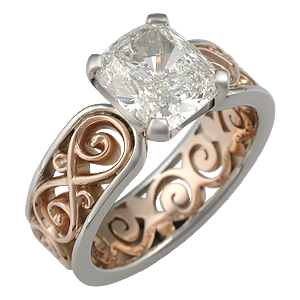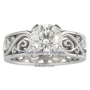 This unusual engagement ring displays a curly infinity symbol repeating around the band. Rails frame the motifs, modernizing the band. Blending together natural and modern elements. A unique setting holds the center stone of your dreams.Shown in all platinum with a one-carat round diamond center.