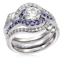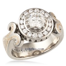 Feel majestic with the Fantasy Queen Engagement Ring. This sculptural ring was inspired by dazzling royal jewels and is the non-mokume version of the original Queen of One. The center stone you select is prong-set into a "crown" of channel-set diamonds or sapphires (0.22 carat total weight). This design can make a modest-sized center diamond appear bigger! The band gracefully splits into a pair of curls at the setting, and measures 6mm wide on the palm-side. Have your regal ring handcrafted out of platinum, palladium or a colored gold.Shown in platinum with a 7mm round brilliant cut diamond center.