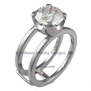 The scaffolding engagement ring is created with an architectural design to hold your wedding band. This simplistic design consists of two slim bands that are held with thin struts. The wedding band of your choice slides between the bands creating a transformative engagement ring. Pricing shown below is for scaffolding engagement ring mounting only. Center Stone and matched Wedding Band are separately priced.Shown in platinum with a round diamond.