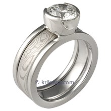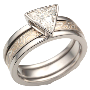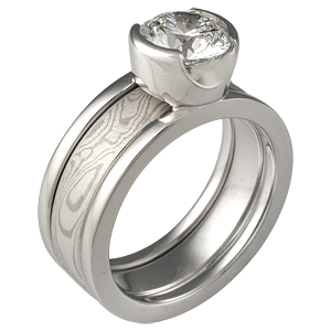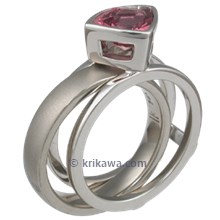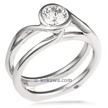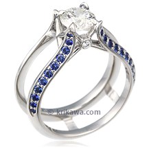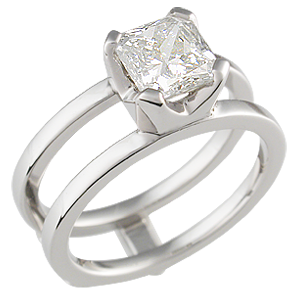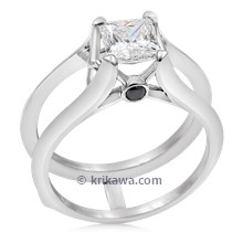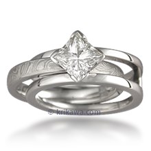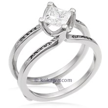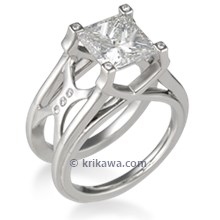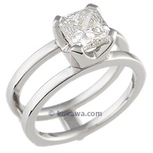 This modern design creates a new look on classic wedding sets. The scaffolding engagement ring is made to house the wedding band of your choice. The slim bands are adorned with inlaid diamonds. An angular prong setting is suspended between the two bands, holding the gemstone of your dreams. Pricing shown below is for scaffolding engagement ring mounting only. Center Stone and matched Wedding Band are separately priced.Shown in platinum with a 0.84ct princess diamond.