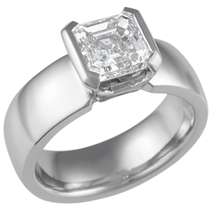 This modern engagement ring is set with a 3/4 carat emerald cut diamond.
