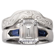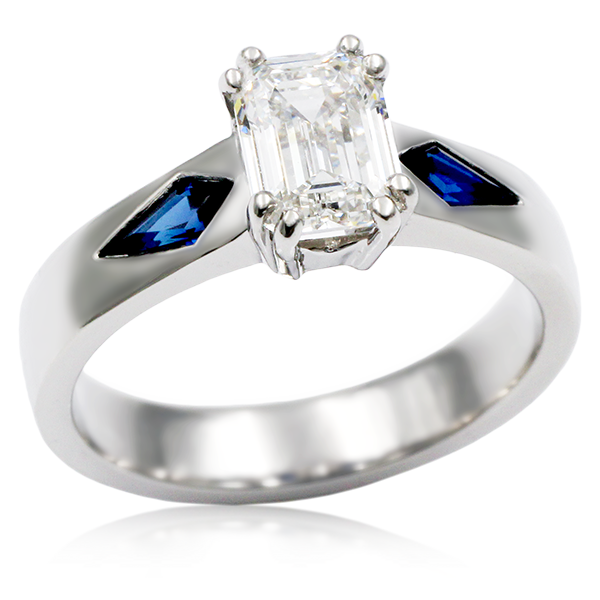 This striking ring resembles a classic solitaire engagement ring with a modern twist. The architectural design includes a wider band with clean inlaid accent stones. Sculptural prongs hold the center stone allowing light to shine through, creating prisms of light. A futuristic take on a three-stone engagement ring.Shown in platinum with an emerald cut diamond and bullet custom-cut sapphire side stones. Center and Accent Stones are not included in the price.