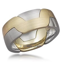 This unique ring combines two separate bands, a mokume band with a solid precious metal band, to create a beautifully contrast design. One band features a small channel of accent stones. The etched mokume plays off the high polish of the plain band accented with your favorite stones.