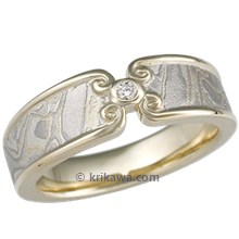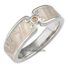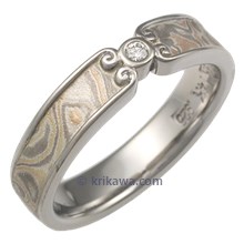 This mokume wedding band has been set with a pink diamond. The band is inlaid with Platinum mokume that has a light etch. Platinum liner.