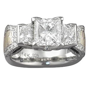 Inspired by the Mokume Borealis Engagement Ring, this version is even more dazzling. Three center stones in a sculptural mounting are embellished by 0.48 ctw pave set diamonds. With the swirling mokume, these elements evoke the astral lights. Ideal cut accent diamonds.Shown in champagne mokume and a platinum liner, with a 4mm designer cut Medicine Wheel sapphire center set in a rose gold head.
