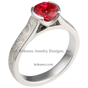 This White mokume engagement ring is set with a 6.5mm lab-grown ruby.