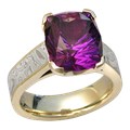 This designer ring has been customized with a gorgeous concave-cut amethyst. Its setting has four prongs and is in yellow gold. The band has inlaid White mokume with a matte finish.