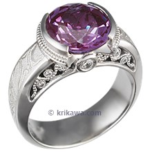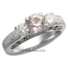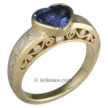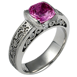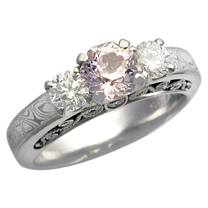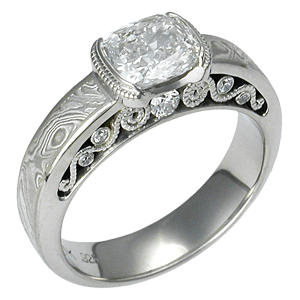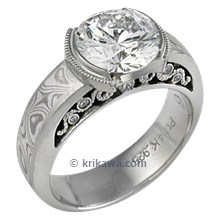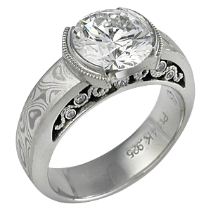 This Mokume Curls Engagement Ring has a 1.40 ct round blue sapphire and White mokume.
