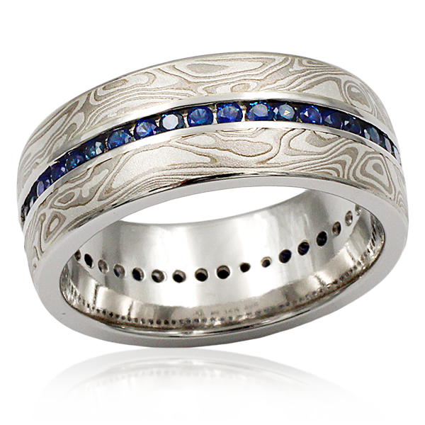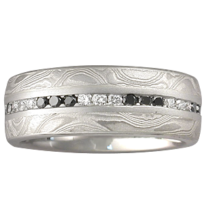 This Mokume Gane Diamond Channel Center Wedding Band has yellow diamonds and a Summer mokume formula with a heavy etch.