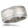 This is a classic designer mokume band with the addition of two diamond channels on the edges. Priced with white ideal cut diamonds.