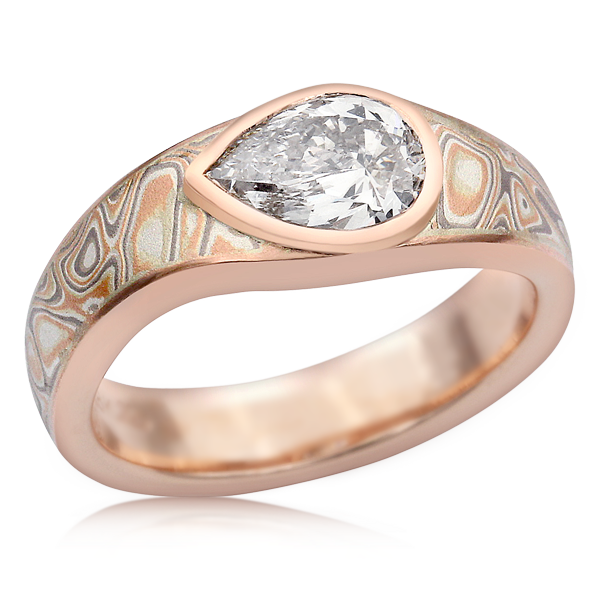 This fluid mokume engagement ring has a bezel-set center stone. The "melting" band is slightly contoured on the top.