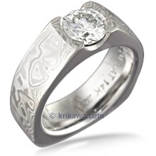 This modern engagement ring is set with a round blue sapphire and inlaid with White mokume gane.