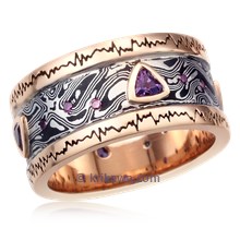 An infinite universe of love and energy await you with this vibrant engagement ring full of movement and character. The center trillion cut stone is surrounded by a halo of diamonds that graduate from light to dark on each side. The mokume band features six bezel set stones as well as pave set stones that run along one side and then cross to the other at the center stone. A truly remarkable work of art; imagine it with your favorite stones!
