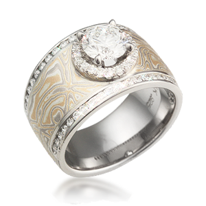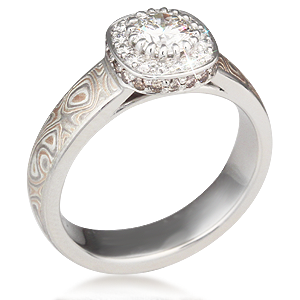 Clean lines and elegant details are the highlights of this design. The mokume gane band has a uniform width until it intersects the head with an elegant taper. A halo of pave set diamonds encircles the solitaire for a simple yet enchanting addition to our classic Mokume Solitaire Tapered Engagement Ring.