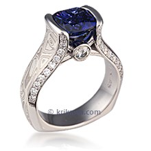 This version of our Juicy Light ring features your center stone suspended between two rolled bezels that rise up from the band for a clean, modern look. Showcasing the elegant curves of this design, pave set diamonds or gemstones frame the mokume inlay and rise up all the way to the top center stone. A surprise side stone sits suspended beneath the center setting.Pick your metal type and stone type for pricing.