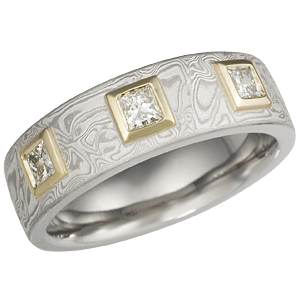 This mokume gane wedding band has three square bezel set stones on the top part of the ring. Inspired by the eternity style Mokume King's Crown.