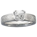 This unique engagement has been customized with a VS2, E, AGS certified, 0.82 ct Excalibur cut diamond. Its band features Platinum mokume with a light etch and a matte finish. Palladium liner and setting. Flush rails, standard edge. 4mm wide. Size 6.