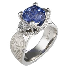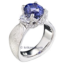 A luxurious ring that would be admired by all the tabloids. Three stones are elevated by artistic prongs as a ribbon of pave surrounds the setting. A one-of-a-kind mokume band wraps around the wide band. The ancient Japanese method of folding precious metals to create an organic pattern will wow everyone. The juicy profile can be easily customized with your choice of metals, mokume, and gemstones.???????Shown in platinum and white mokume with an 8mm cushion-cut moissanite and two 5mm trillion blue sapphires.