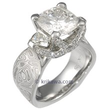 This handmade engagement ring has a round white diamond and two half-moon-shaped blue sapphires. As they are elevated by artistic prongs with a ribbon of pave wrapped along the band. A curvaceous band has our one-of-a-kind mokume inlaid. Easily customizable with your choice of gemstones, metal color, and mokume-gane.Shown in platinum and white mokume with diamonds and blue sapphires.