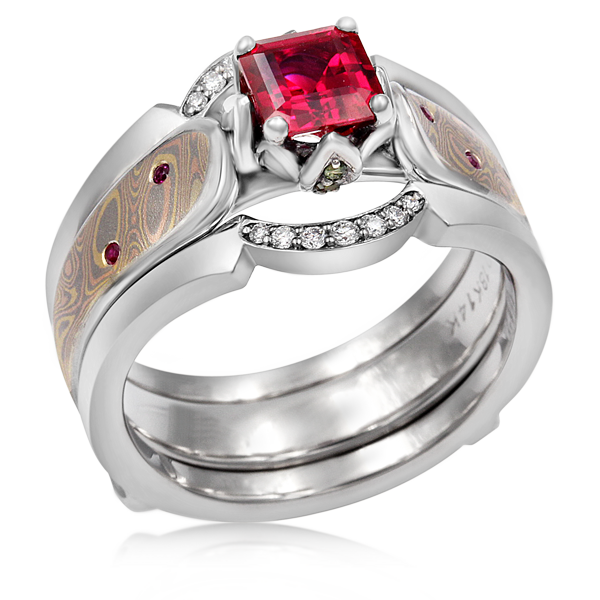 Inspired by a fairy tale and love story, this engagement ring features a blossoming center stone wrapped in brilliant diamond or gemstone accented leaves. The band tapers to a petal-like point and is inlaid with mokume gane and flush-set accent stones. The curves and contours of this design create an elegant masterpiece, ready for your personal touch!