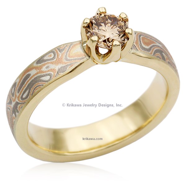A classic design elevated by unique mokume and stone choices. This version of the Mokume Solitaire Tapered Engagement Ring remains delicate with a vivid choice of colors. The band curves around your finger as it tapers towards the center stone. A set of delicate prongs elevates a precious stone allowing it to shimmer. Imagine the possibilities of this classic design with your choice of customization.Shown in 14k yellow gold with champagne mokume and 0.50ct champagne diamond.