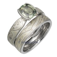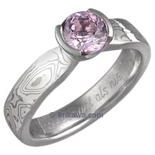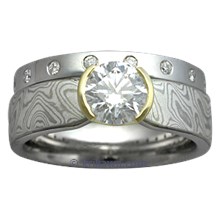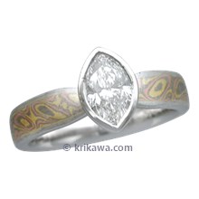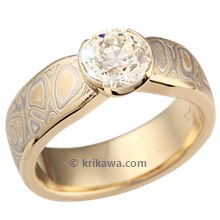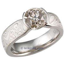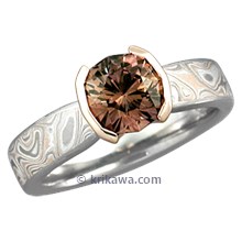 This Mokume Solitaire Tapered Engagement Ring has been customized with a champagne diamond. Its setting rests on a band of high polished Champagne mokume.