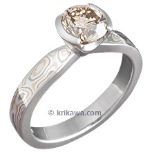 This custom engagement ring has a marquise diamond set in a full bezel. The warm hues in the Trigold mokume are juxtaposed with the white center stone and liner.