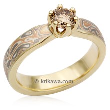 This simple engagement ring has a single stone set in prongs at the top of a mokume band. The band tapers near the stone putting more focus on your center stone.