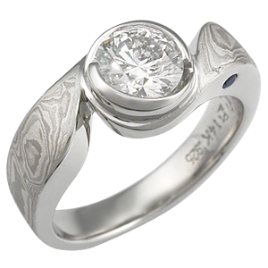 This mokume solitaire engagement ring is set with a Celestial Compass designer cut spinel by Larry Woods.