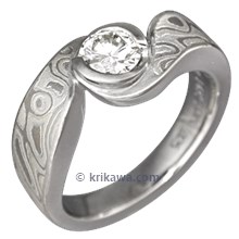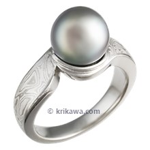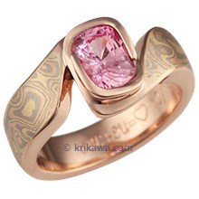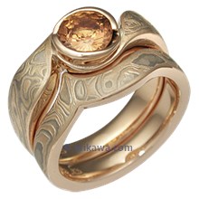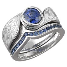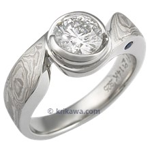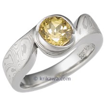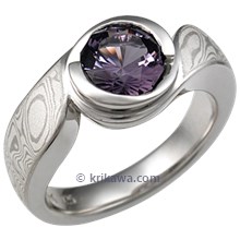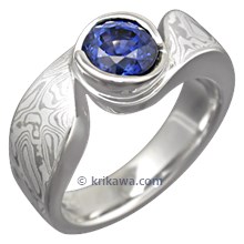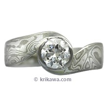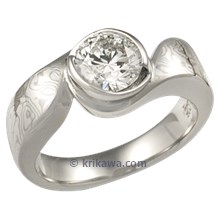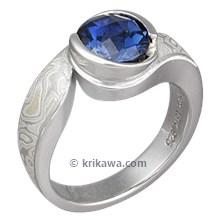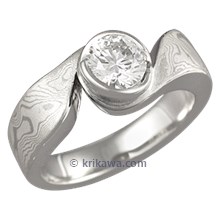 Mokume gently swirls around the center bezel set stone in this solitaire engagement ring. The sensual flow of the design works well with the organic pattern of the mokume. Wear it alone or pair it with a custom contoured wedding band. At the widest point, the band measures 5mm tapering to 3.5mm on the palm side.