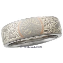 The symbol in this unique ring represents a peak in the Rockies that is meaningful to the client. The mountain is framed with rose gold. This band features our Winter mokume. 7mm wide.