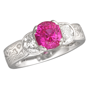 This designer engagement ring features an oval center stone embellished by two half moon side stones. A band of mokume gane tapers towards the setting.