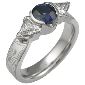 A blue sapphire is flanked by trilliant diamonds in this handcrafted engagement ring. The band is inlaid with Platinum mokume. This ring is paired with a contoured wedding band which also has Platinum mokume.