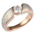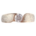 This white mokume ring is elegantly tapers down to a mere 3mm width at the palm. Shown here with a 0.61ct round diamond, and 14k rose gold liner.