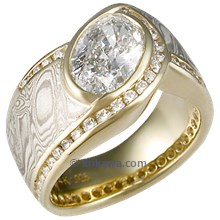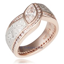 The allure of our organically shaped mokume band, is meticulously contoured to complement a variety of stone shapes. The centerpiece, a stunning marquise diamond, is seamlessly flush set into the band. As the band gracefully thickens toward the top of the finger, it provides the perfect depth to showcase the brilliance of the stone.