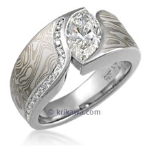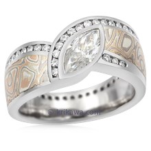 Shown in 14k white gold, white mokume with 1.57ct ocean blue marquise diamond